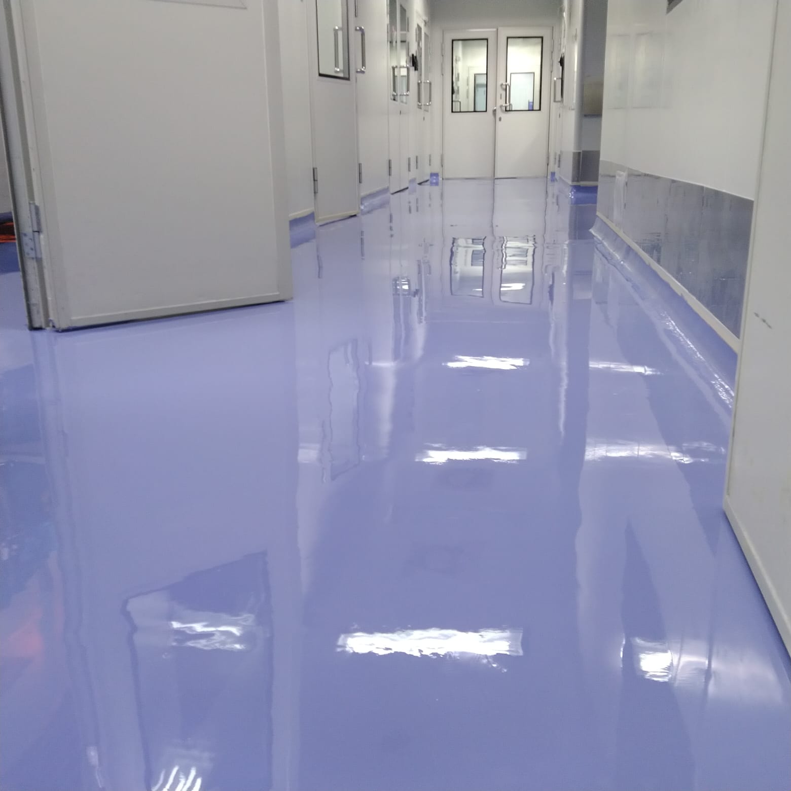 Pekerjaan pelapisan dinding dan lantai menggunakan sistem epoxy untuk meningkatkan daya tahan, kebersihan, serta estetika area kerja.